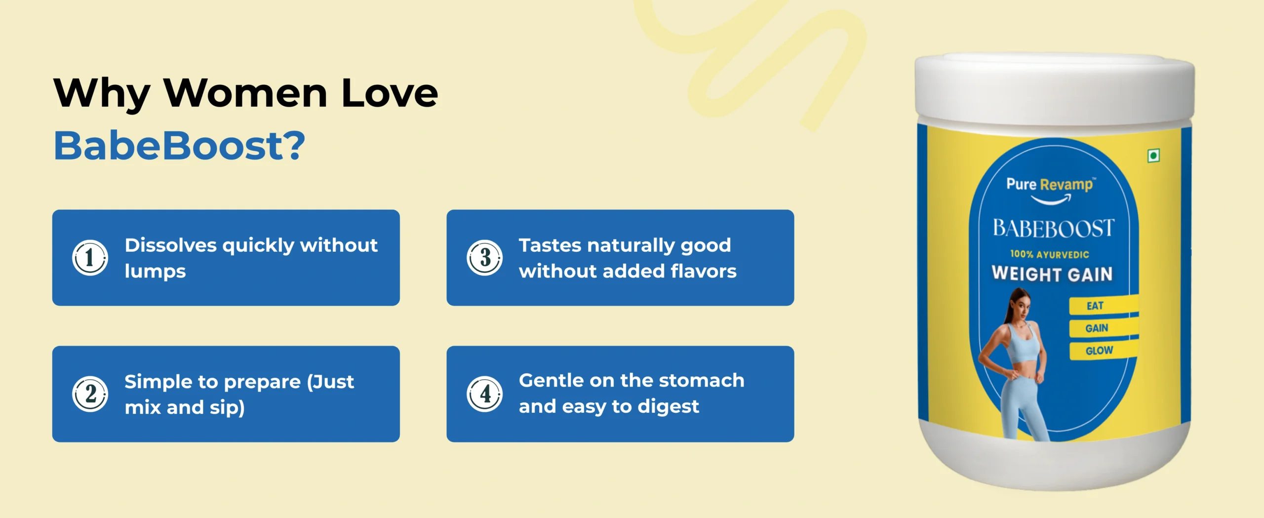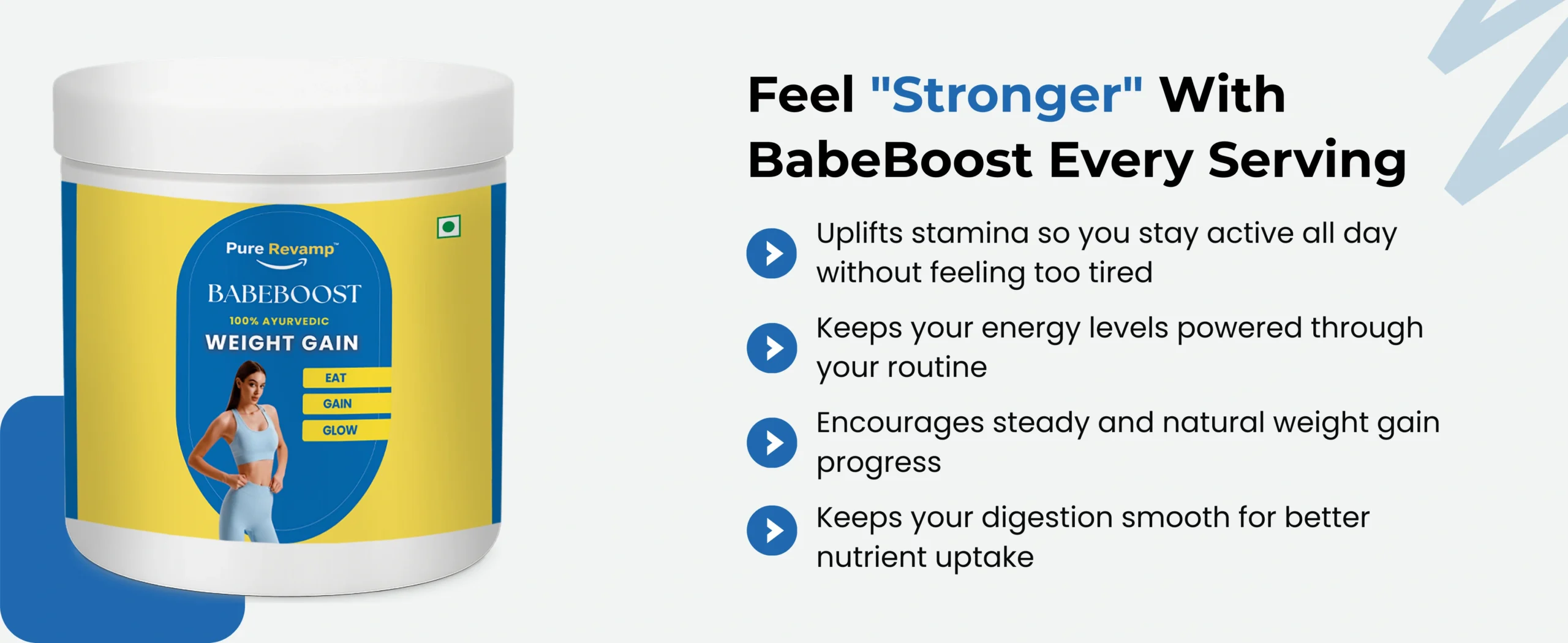 BabeBoost is India’s most trusted Ayurvedic weight gainer for women — a carefully formulated weight gain powder designed specifically for women who struggle with being underweight, low appetite, or slow metabolism.
