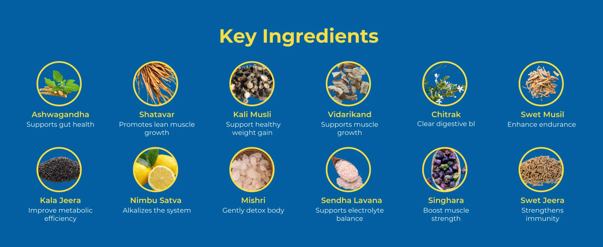 India’s #1 Ayurvedic weight gain powder designed exclusively for women. Made with 12+ potent herbs including Shatavari, Ashwagandha, Safed Musli & Vidarikand to naturally boost appetite, improve digestion, and promote healthy weight gain — without bloating, chemicals, or side effects.