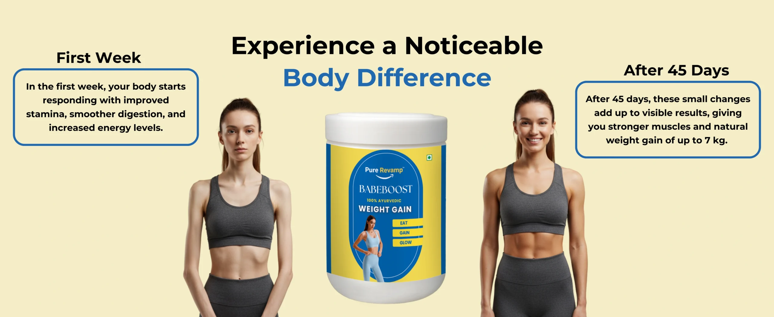 BabeBoost is an Ayurvedic weight gainer for women, which means it works gradually and sustainably rather than delivering sudden, artificial changes. Most women begin to notice improved appetite and better energy levels within the first 7 to 10 days of consistent use. By weeks 3 to 4, visible physical changes — including an increase in body mass and improved strength — typically become noticeable. Full, satisfying weight gain results are generally achieved by the end of a 45-day course with regular use. Consistency is essential — BabeBoost works best when taken twice daily without interruption, alongside the personalized diet plan provided with your order.