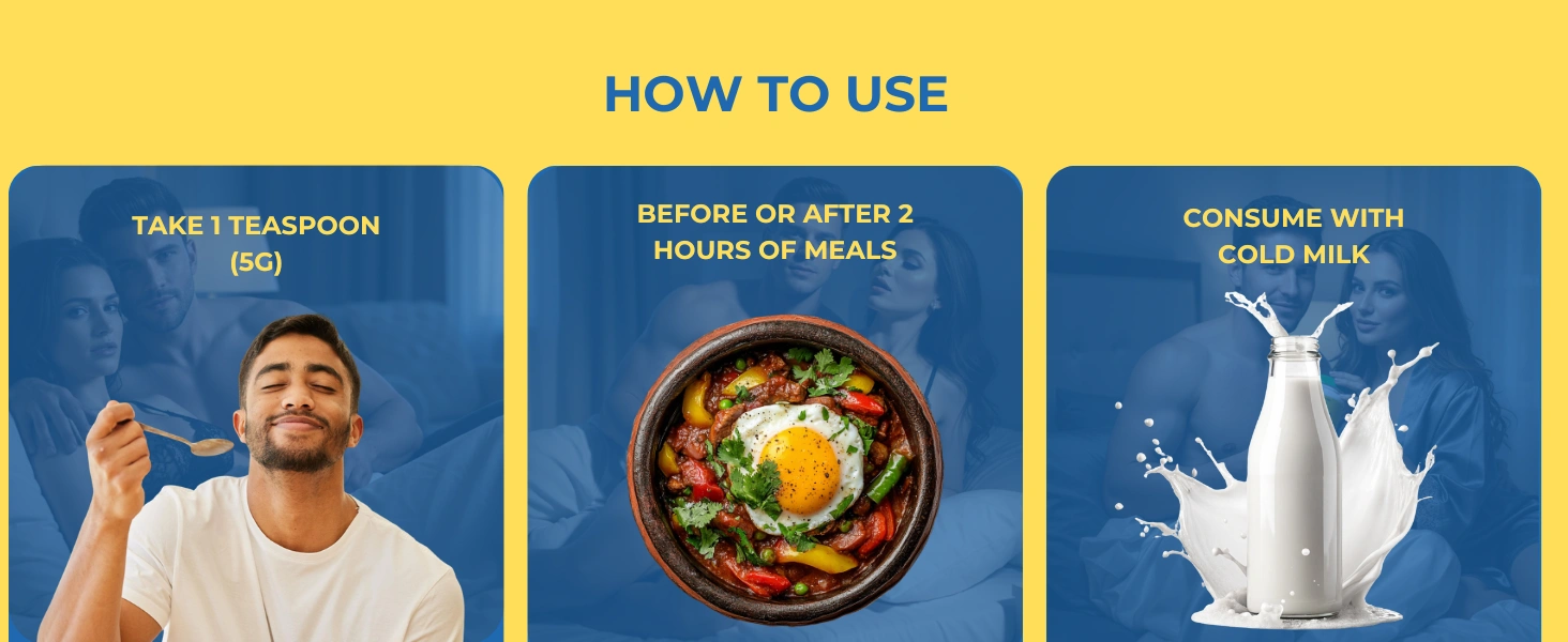 Step 1 — Scoop: Take one teaspoon (approximately 5g) of PureNyte medicinal paste. Step 2 — Mix: Add to a glass of cold milk and stir well until fully blended. Step 3 — Consume: Drink daily, preferably 2 hours before bedtime for optimal absorption.